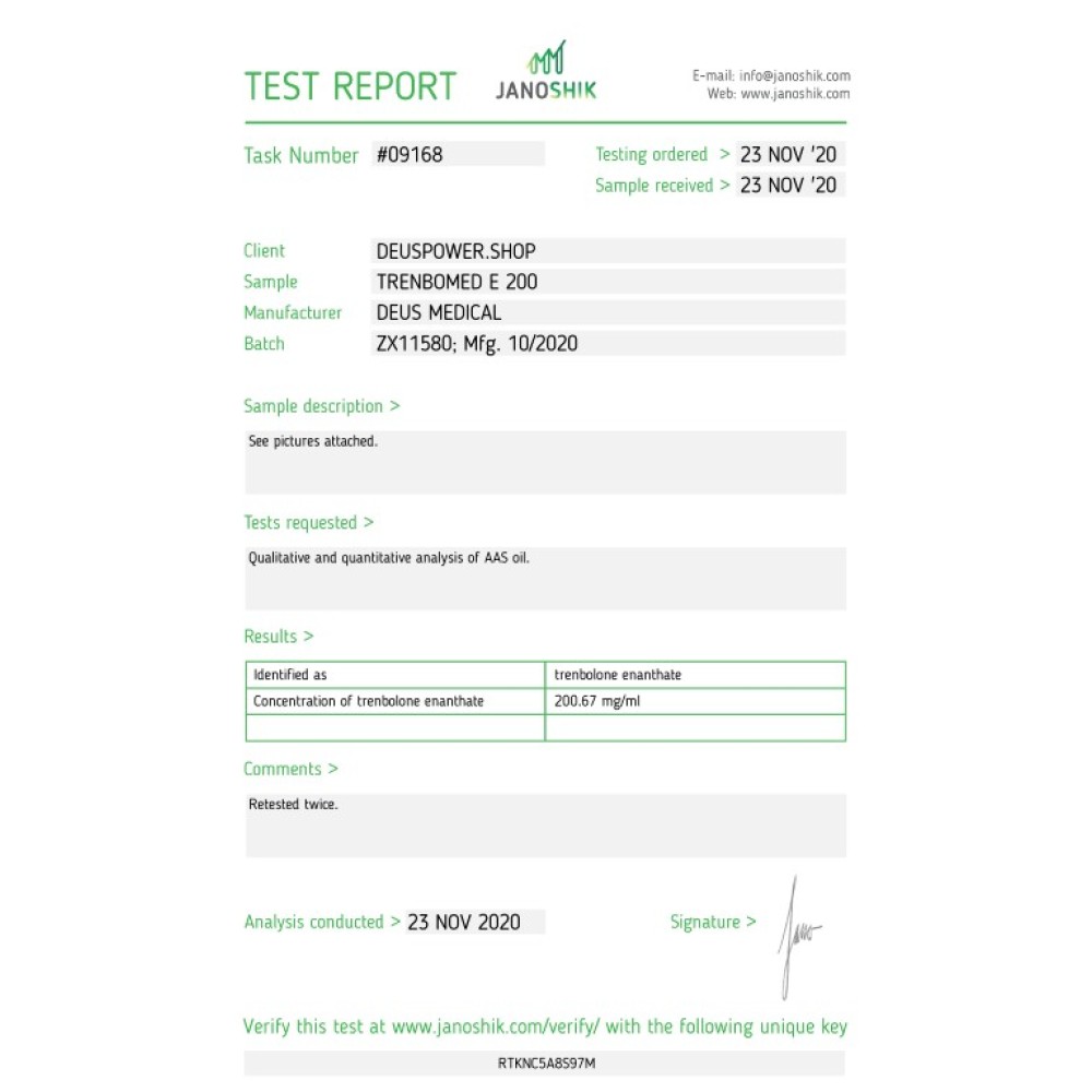 Specifikacije TRENBOMED E 200 (TRENBOLONE ENANTHATE) INJECTABLE STEROID IN AMPOULES Deus Medical